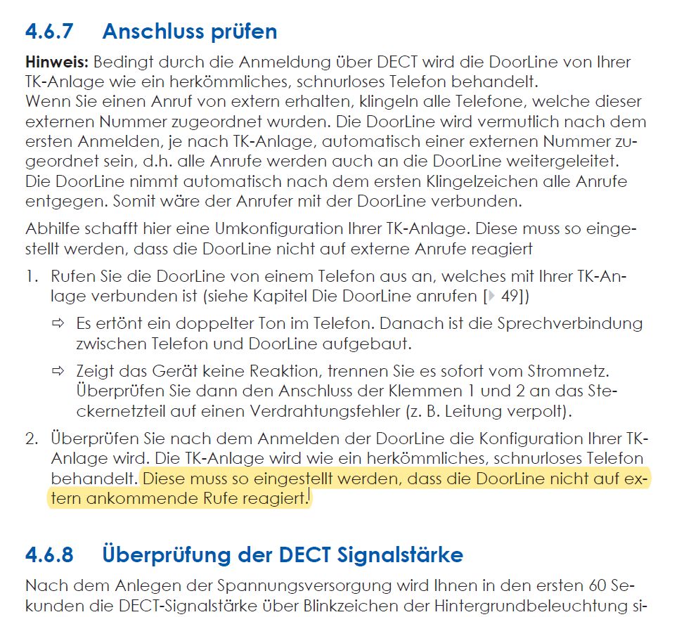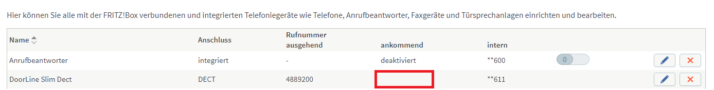 damit die Doorline Slim DECT einen externe Telefonanrufe nicht entgegennehmen kann, müssen Sie die Rufnummer für ankommende Rufe im Fritzbox Konfigurator >>>Telefonie >>>> Telefoniegeräte, rausnehmen. Sehen Sie hierzu Seite 21 der Bedienunganleitung im Anhang, bzw. die Screenshots wie im Anhang.