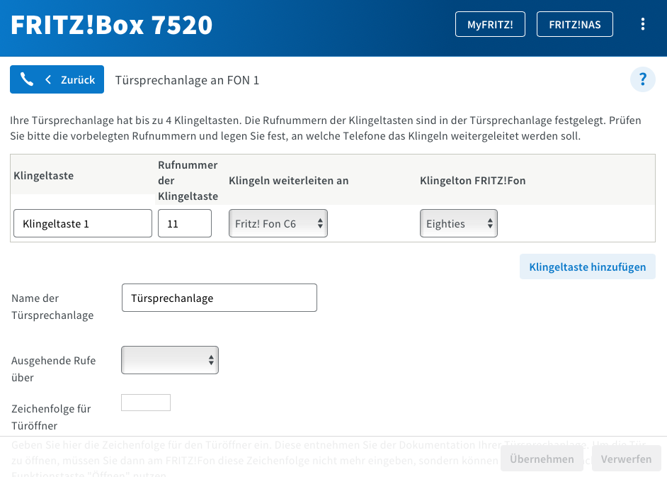 Doorline a/b T01 mittels RJ11 Stecker an Fritzbox 7520