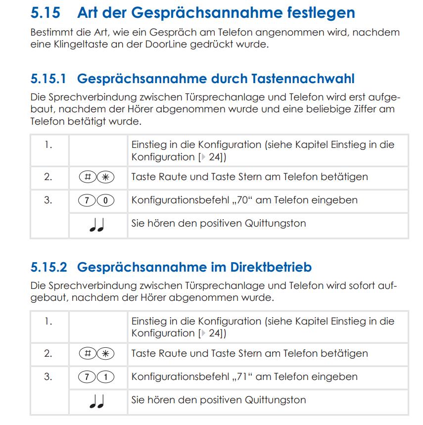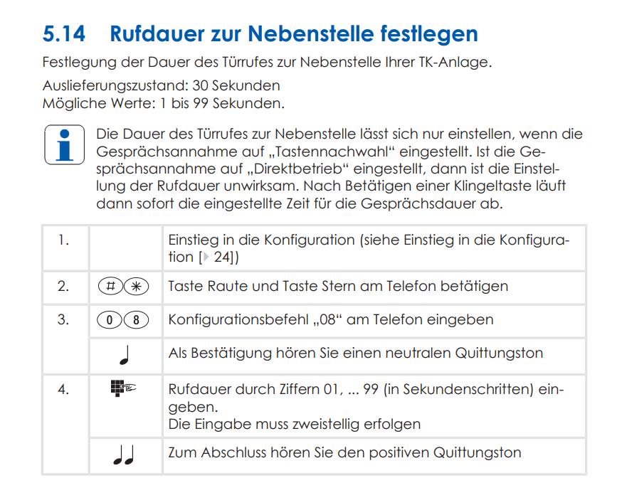 Ja die Zeit der Rufdauer kann eingestellt werden, aber nur wenn die Doorline sich "m Modus - Gesprächsannahme - nach Tastennachwahl befindet, diese Programmiert ist.