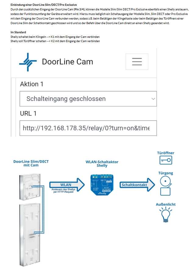 um die vorhandenen Doorline DECT "Smart >Home" fähig zu machen , bzw. um Shelly Aktionen auzulösen , müsen sie je nach Bedarf die Relaiskontakte K1 / K2 der DL Dect mit den Pins 3+4 der DL Cam verbinden .